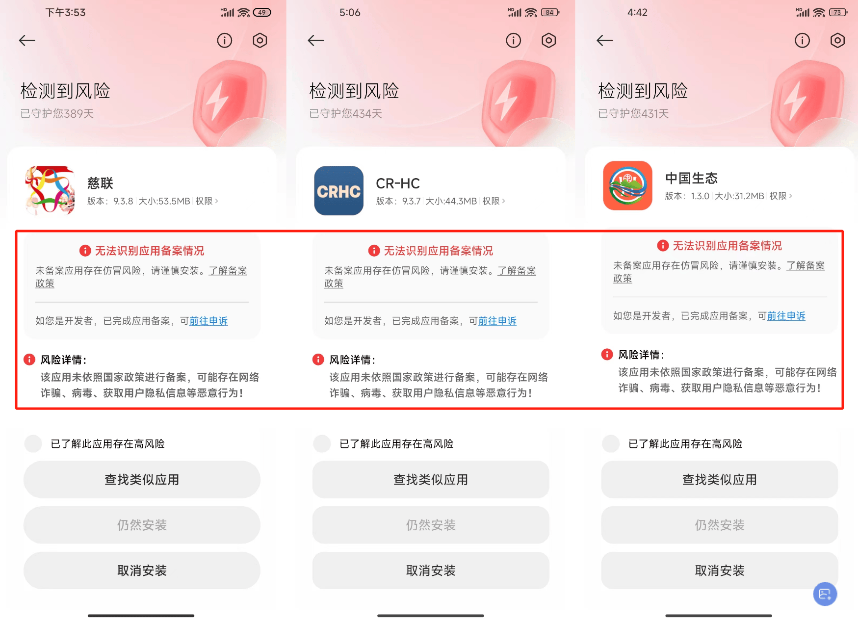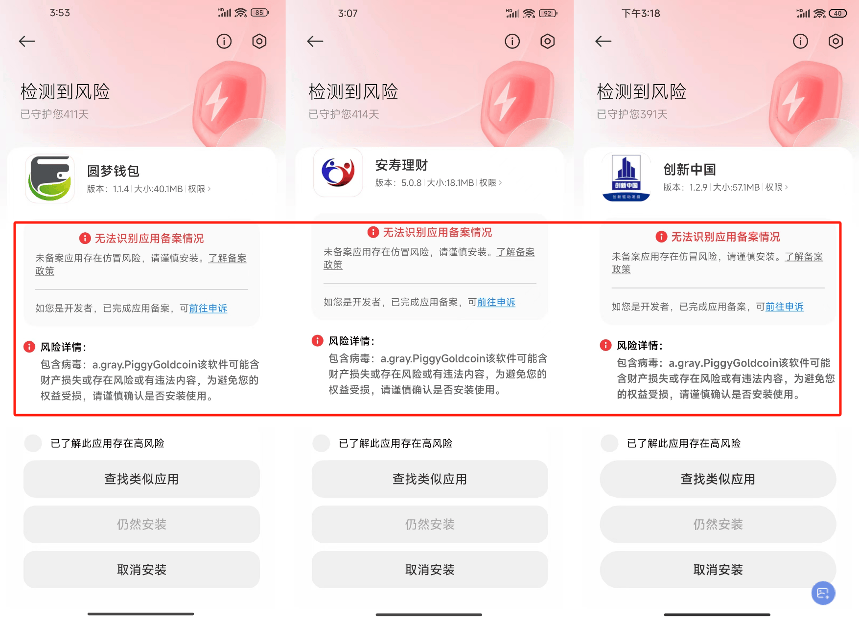 細(xì)心的網(wǎng)友可以發(fā)現(xiàn),這類詐騙軟件在下載安裝時可以發(fā)現(xiàn),這些APP被提示:該應(yīng)用未依照國家政策進(jìn)行備案,可能存在網(wǎng)絡(luò)詐騙、病毒、獲取用戶隱私信息等惡意行為!部分APP還提示包含病毒!