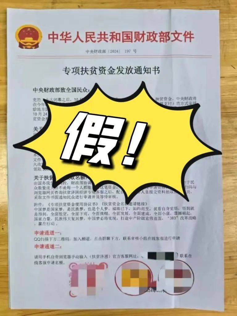 經(jīng)核查,“中央財政部【2024】197號”與國家某部委的文號明顯不符,且兩份文件關(guān)于所涉部門名稱及職責(zé)相關(guān)內(nèi)容漏洞百出,“專項扶貧資金發(fā)放通知書”明顯是偽造公文。