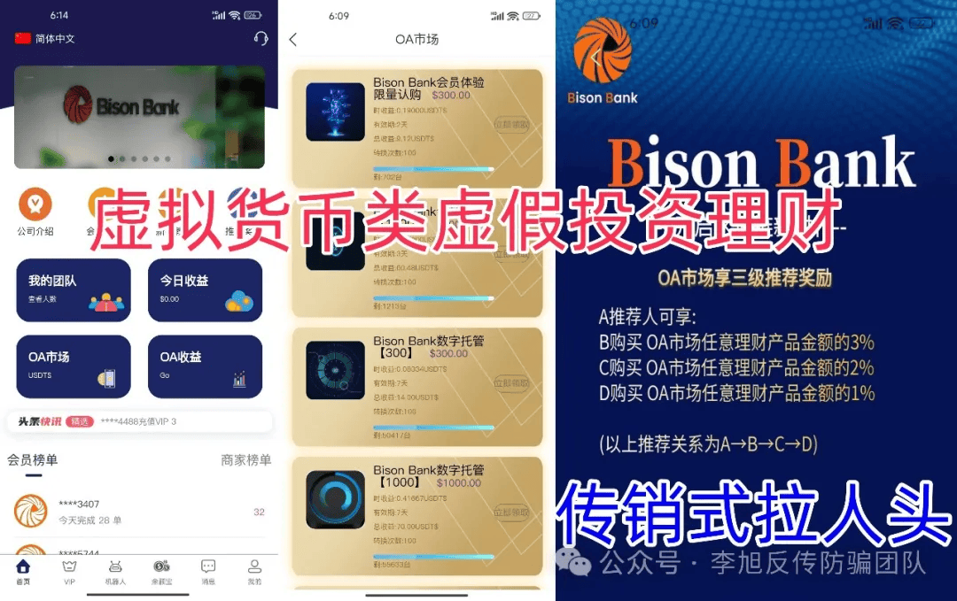 發(fā)表時間:2024-07-07 15:45作者:李旭反傳銷來源:李旭反傳防騙團隊 全民反詐,識騙防騙 識別虛假APP:詐騙團伙制作的非法APP無法在手機官方應用市場上架,只能通過點擊網(wǎng)址鏈接或掃描二維碼的方式讓用戶下載。因此非官方應用市場下載的,都是黑平臺,千萬別下載! 警惕向個人賬戶轉賬:購買理財產品,需要簽訂協(xié)議,資金將自動扣劃。要求轉賬到個人賬戶或對公賬戶與平臺名稱不符的,都是詐騙平臺,千萬別轉賬! 貝恩 基金理財APP(貝森Bison):崩盤跑路,小編在7月1日進行了曝光,僅僅時隔4天,就有網(wǎng)友反饋,該項目崩盤跑路