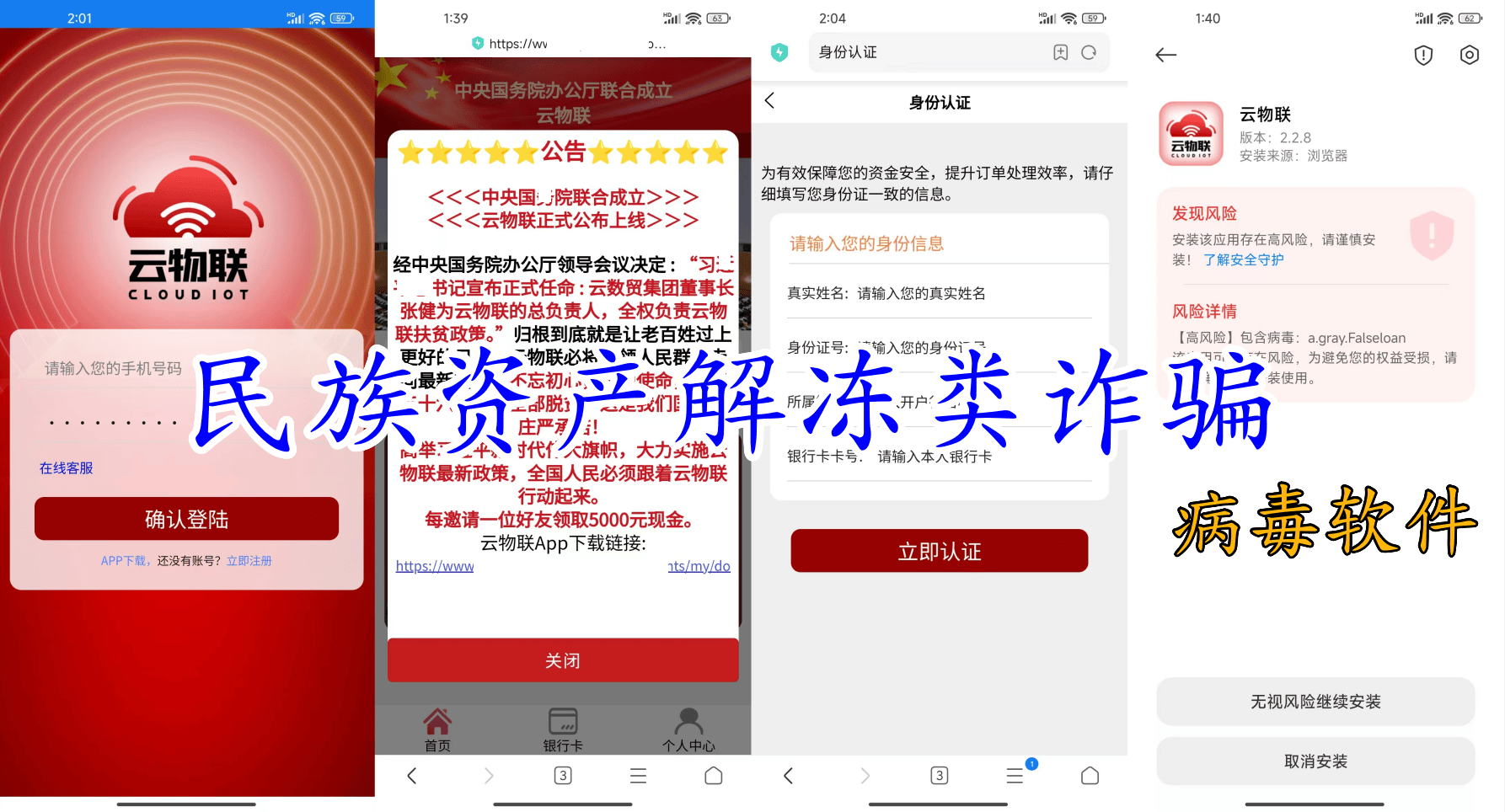 云物聯(lián)APP——民族資產(chǎn)解凍類詐騙,打著云數(shù)貿(mào)旗號(hào)的詐騙項(xiàng)目,APP包含病毒,打著云數(shù)貿(mào)旗號(hào)的扶貧類詐騙項(xiàng)目,虛假宣傳云數(shù)貿(mào)集團(tuán)董事長(zhǎng)張健為云物聯(lián)的總負(fù)責(zé)人,全權(quán)負(fù)責(zé)云物聯(lián)扶貧政策。