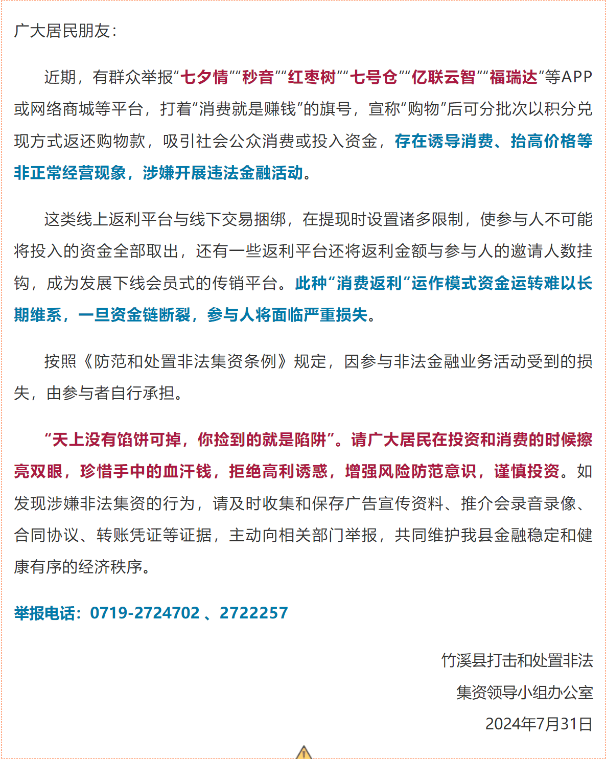 竹溪縣發(fā)布風(fēng)險提示:警惕這幾個平臺涉嫌“消費(fèi)返利”騙局