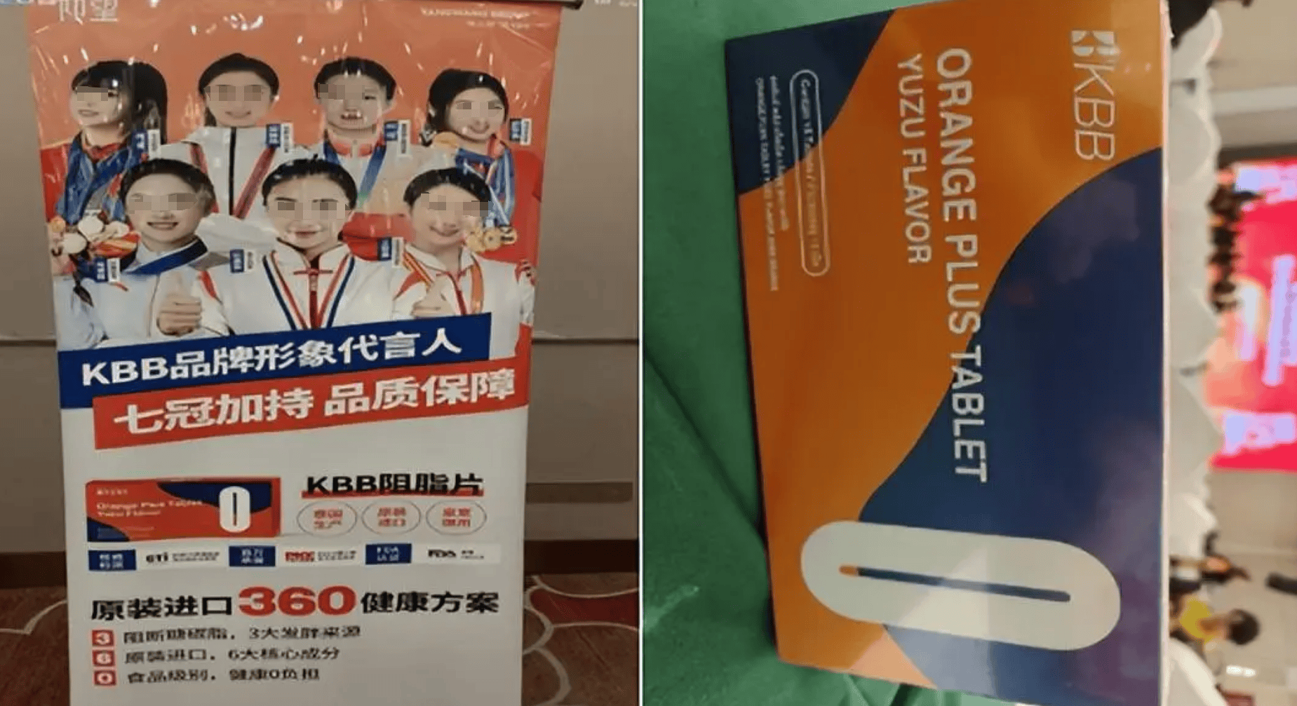 這款名為KBB阻脂片的產(chǎn)品使用體育冠軍作為品牌形象代言人,宣稱“泰國生產(chǎn)、原裝進(jìn)口、皇室御用”。并打出“原裝進(jìn)口360健康方案”的宣傳口號,③阻斷糖碳脂,3大發(fā)胖來源⑥原裝進(jìn)口,6大核心成分O食品級別,健康0負(fù)擔(dān)。