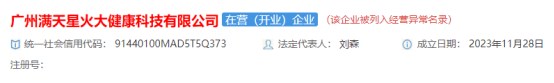 本網(wǎng)注意到廣州滿天星火大健康科技有限公司,因通過登記的住所或者經(jīng)營場所無法聯(lián)系的原因被廣州市市場監(jiān)督管理局列入經(jīng)營異常名錄。