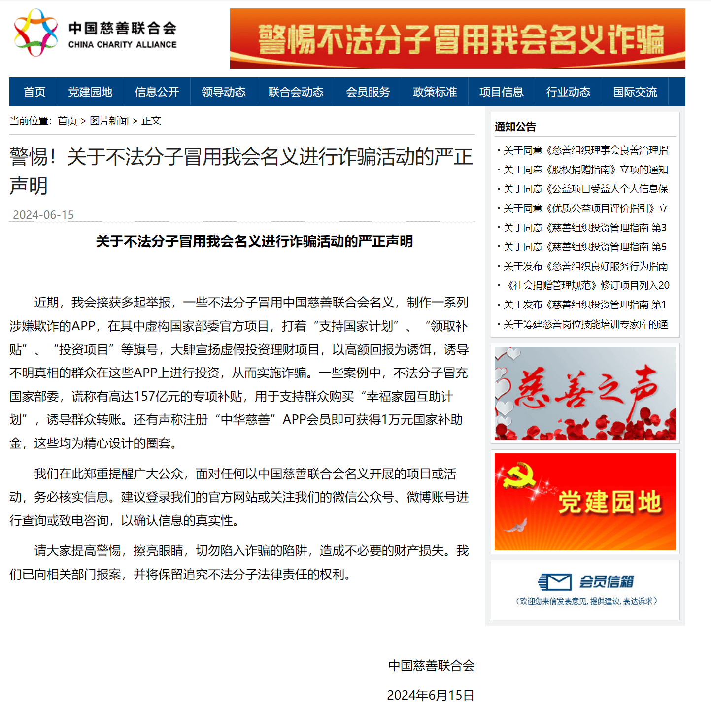 一些不法分子冒用中國(guó)慈善聯(lián)合會(huì)名義,制作一系列涉嫌欺詐的APP,在其中虛構(gòu)國(guó)家部委官方項(xiàng)目,大肆宣揚(yáng)虛假投資理財(cái)項(xiàng)目,以高額回報(bào)為誘餌,誘導(dǎo)不明真相的群眾在這些APP上進(jìn)行投資,從而實(shí)施詐騙。