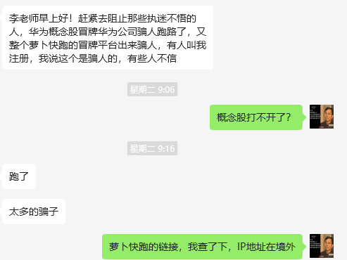 華為概念股:冒牌騙局,不法分子冒充華為的名義,虛構(gòu)股權(quán)投資項(xiàng)目實(shí)施詐騙活動(dòng),據(jù)網(wǎng)友反饋目前無(wú)法打開(kāi),已經(jīng)崩盤(pán)跑路,參與者請(qǐng)積極報(bào)案!