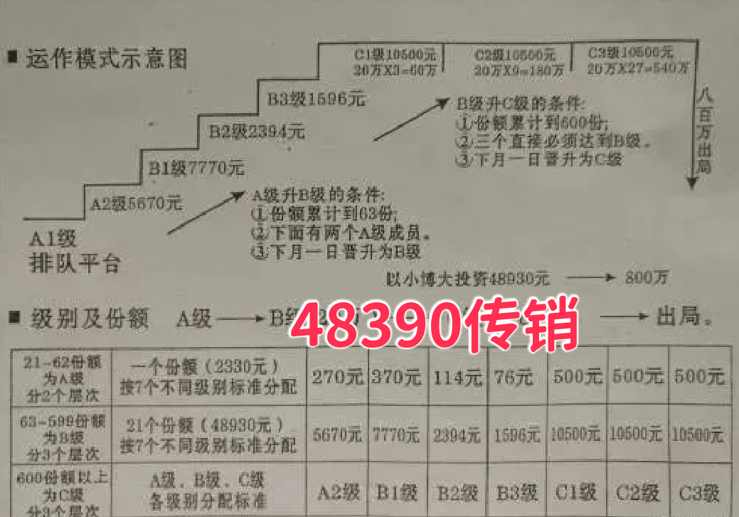 該“民間自愿互助理財(cái)”組織采取“五級(jí)三晉制”的晉級(jí)發(fā)展模式,團(tuán)隊(duì)按照從低到高的順序分為發(fā)展層、A層、B層、C1層、C2層、C3層。要加入該組織需要投資人交納48930元,交完錢(qián)成為該組織的發(fā)展人員,這時(shí)發(fā)展層人員可以發(fā)展下線,同時(shí)該組織的其級(jí)別人員也可以發(fā)展下線,發(fā)展來(lái)的人員都可以放在發(fā)展層。