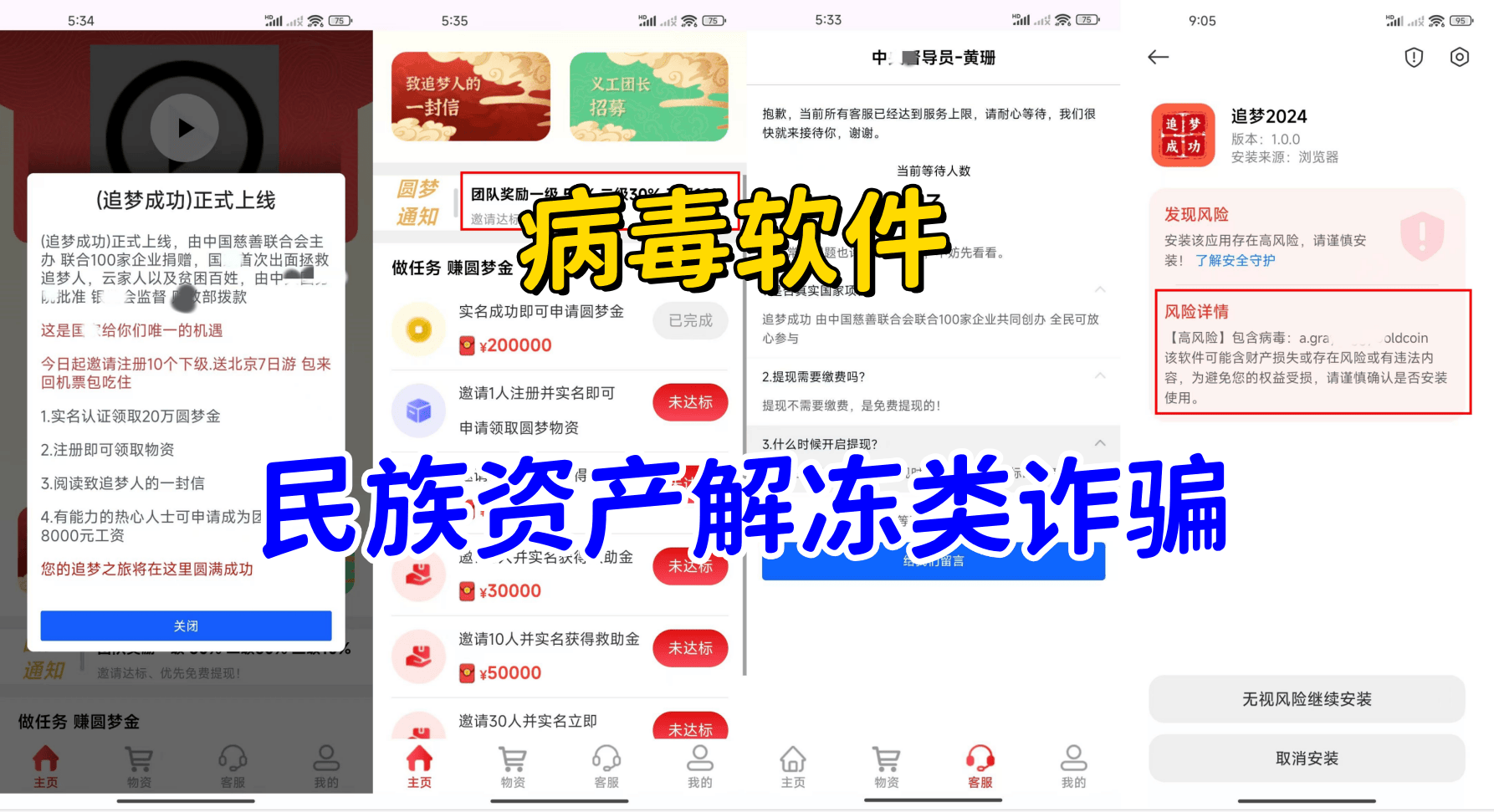 追夢成功2024:民族資產(chǎn)解凍類詐騙,不法分子冒充“中國慈善聯(lián)合會”的名義,打著拯救“追夢人、云家人、貧困人群”,發(fā)放圓夢金的名義實(shí)施詐活動(以中國夢為主題,要想拿到國家的福雨就要先給國家購買75克黃金,然后給你指定的地址寄去?。?,該應(yīng)用未再相關(guān)部門備案,同時該應(yīng)用帶病毒,如有遇到請遠(yuǎn)離。