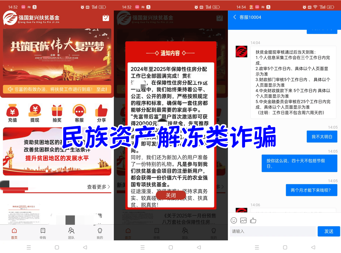 強(qiáng)國復(fù)興扶貧基金:民族資產(chǎn)解凍詐騙,不法分子冒充國家某部門的名義,虛構(gòu)扶貧項(xiàng)目實(shí)施詐騙活動(dòng),網(wǎng)友反饋投資后無法提現(xiàn),收款賬戶均屬于第三方個(gè)人賬戶。
