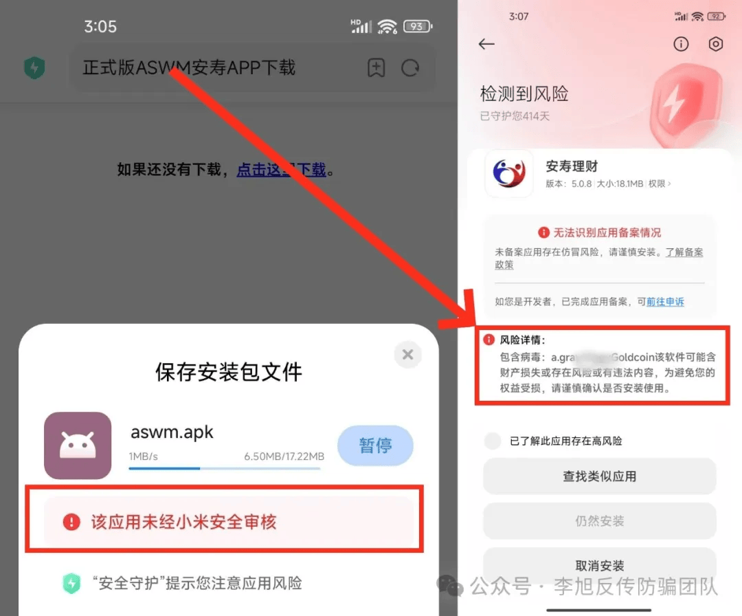 這個(gè)“安壽理財(cái)”平臺(tái)卻查詢不到,只能通過群中的鏈接才能下載,下載時(shí)提示該應(yīng)用為經(jīng)過安全審核,安裝時(shí)提示該應(yīng)用無法識(shí)別備案信息,并且包含病毒存在財(cái)產(chǎn)損失或存在風(fēng)險(xiǎn)或有違法內(nèi)容。