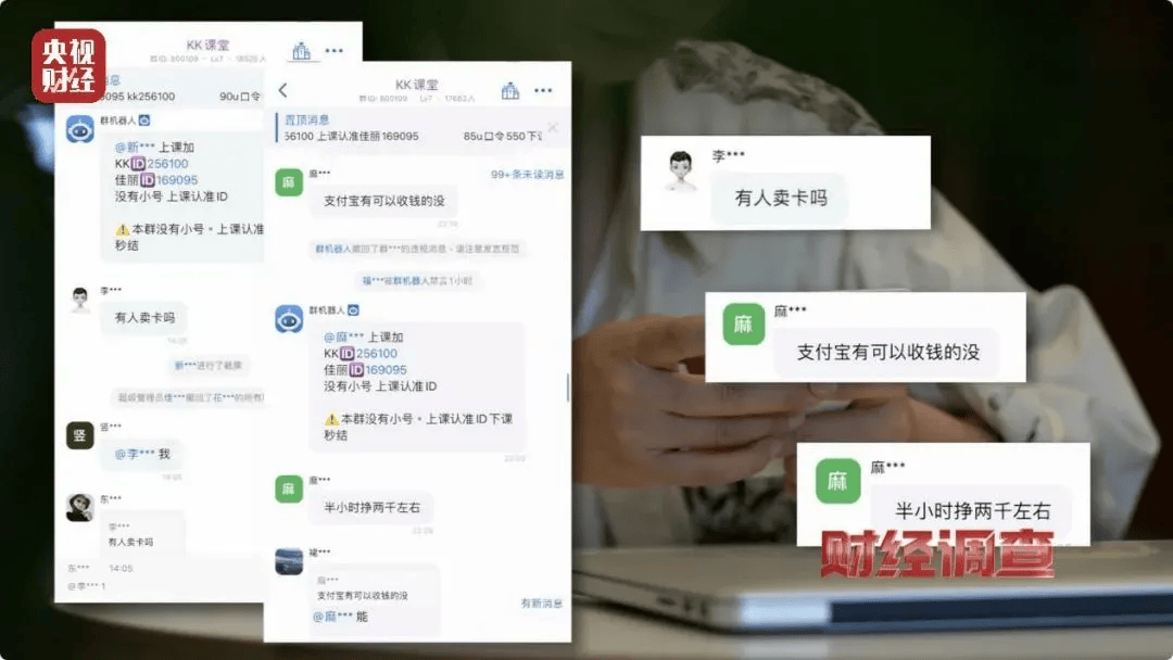 記者進(jìn)入一個(gè)有著近2萬(wàn)人、名為“KK課堂”的群,群內(nèi)頻繁出現(xiàn)“有人賣(mài)卡嗎” “支付寶有可以收錢(qián)的沒(méi),半小時(shí)掙兩千左右”等信息。另一個(gè)名為“大學(xué)生兼職”的QQ頻道中,也不時(shí)有人發(fā)布高額傭金的“代收”信息。