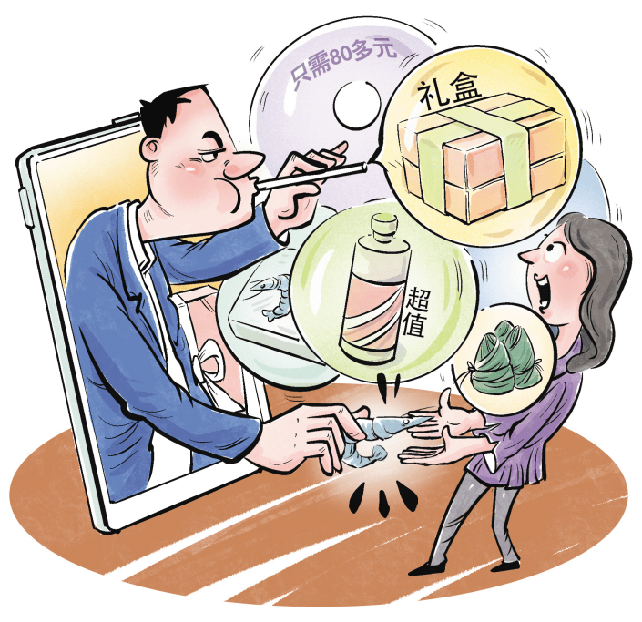 漫畫:高岳 直播賣貨滿口承諾 到手發(fā)現(xiàn)貨不對(duì)板 今年6月,端午節(jié)前夕,湖南省長沙市的王莎(化名)在刷直播時(shí)偶然發(fā)現(xiàn)一個(gè)賣端午禮盒的直播間,商品鏈接寫著“超值王炸 飛天茅臺(tái)53度+鮮活速凍大白蝦+五芳齋粽子禮盒”,到手只需80多元?!拔覀兊纳唐凤@示有什么就會(huì)給您發(fā)什么,這個(gè)您放心?!痹诼牭街辈ラg主播這樣的承諾后,王莎立即搶購了該禮盒,同時(shí)還向客服詢問發(fā)不發(fā)茅臺(tái),客服表示正常發(fā)貨?! 爱?dāng)時(shí)以為自己真的很幸運(yùn),搶到了禮盒,沒想到都是商家虛假宣傳的套路。”王莎表示,她收到禮盒后發(fā)現(xiàn),里面只有蝦,粽子和茅臺(tái)都沒有。她的第一反應(yīng)就是退貨退款,沒想到商家以生鮮商品不支持七天無理由退貨為由,拒絕了退款,還說她只選擇了蝦?!皩?shí)際上根本沒有任何選項(xiàng),直接拍的就是禮盒套裝?!?/p> 王莎說,在向平臺(tái)客服反映后,客服也表示生鮮商品退不了款,她的退款選項(xiàng)后來被關(guān)閉了?!霸谏唐吩u(píng)論區(qū),我看到很多消費(fèi)者都因?yàn)樯碳业奶摷傩麄髻徺I了這款商品,大部分也都沒能成功退款?!?/p> “帶殼金枕5斤大榴蓮,99元5斤精選A果,179元10斤精選B果,每個(gè)包5房,干包大黃肉?!痹谝恢辈ラg內(nèi),主播滿口承諾“壞果包賠”,但記者點(diǎn)進(jìn)商品詳情頁發(fā)現(xiàn),評(píng)論區(qū)內(nèi)不少消費(fèi)者都說自己收到的是壞果、爛果,根本不像直播間宣傳的那樣。 近日,有多位消費(fèi)者向記者反映,他們?cè)庥隽酥辈ラg榴蓮騙局。一些主播稱自己剛做直播,是新號(hào),所以出售的榴蓮價(jià)格便宜,消費(fèi)者下單后收到的卻是一個(gè)只有兩三斤重的爛果。這些直播間里往往沒有新鮮榴蓮展示,有的只是宣傳圖片和視頻,旁邊會(huì)擺一個(gè)塑料榴蓮。等購買達(dá)到一定數(shù)量后,這些主播就會(huì)銷號(hào)跑路,網(wǎng)店客服從不回應(yīng)和解決任何問題。 記者采訪發(fā)現(xiàn),像這樣因主播虛假宣傳而購買商品,到手后貨不對(duì)板的情況還有很多。比如直播間宣傳自己賣的牛羊肉是8分瘦肉2分肥肉,結(jié)果消費(fèi)者收到后肉眼可見一大半全是肥肉;收到的釣魚竿與直播間展示的完全不一樣,就是一根殘次品;直播間宣傳展示的都是實(shí)木家具,到手后卻發(fā)現(xiàn)為夾木跟纖維板…… “每克3.9萬美元,被稱為抗癌王,免疫王,排毒王”“108味中草藥,24道工序,36個(gè)周期,6年封缸發(fā)酵而制成”……不久前,江蘇省揚(yáng)州市的楊洋(化名)在自己70多歲父親的手機(jī)群聊里,看到了這樣的刷屏信息。 在楊洋追問下,老楊說自己加的是某保健品公司的粉絲群,群里會(huì)提前發(fā)一些直播間商品的信息。該公司目前正在推的是一款益生菌產(chǎn)品,一盒2000多元,稱可以“抗衰老,治百病,延年益壽”。 “他們賣的益生菌產(chǎn)品,盒子上寫著有2000億菌群,但在直播間主播宣傳時(shí)卻說是一袋就有2000億菌群,一袋頂市場(chǎng)上其他品牌產(chǎn)品幾盒的功效?!睏钛笳f,同類型益生菌在網(wǎng)上也就賣七八十元,但父親對(duì)直播間的宣傳話術(shù)深信不疑,認(rèn)為商品賣2000多元還是主播爭(zhēng)取來了大優(yōu)惠?!拔野终嬗X得這玩意兒能治病,有點(diǎn)頭疼腦熱的第一反應(yīng)是沖一袋益生菌喝。” 記者調(diào)查發(fā)現(xiàn),讓楊洋父親“深信不疑”的直播間并非個(gè)例。一些直播間通過打造夸張的人設(shè)和劇情演繹,夸大商品功效、質(zhì)量,誘使直播間觀眾信以為真。如果不看商品介紹頁面,只聽主播講解,消費(fèi)者下單就很容易被坑。 據(jù)報(bào)道,在某平臺(tái)擁有6898萬粉絲的網(wǎng)紅“太原老葛”近日因涉嫌詐騙被立案。此前,太原老葛曾帶貨“復(fù)活項(xiàng)鏈”,聲稱能遇難成祥、死而復(fù)生,直播中一位大娘戴上后聲稱疼痛緩解。此劇情演繹可能誤導(dǎo)不明真相的老人購買。 夸大功效吸引購買 含糊其詞規(guī)避監(jiān)管 “嬌嬌,幫我在網(wǎng)上買個(gè)東西,我聽主播說得可好了。” 今年7月,安徽省安慶市的李嬌(化名)收到奶奶發(fā)來的消息,想讓她幫忙購買一款無花果。李嬌打開直播鏈接一看,其標(biāo)價(jià)居然高達(dá)268元一斤,是普通無花果的數(shù)倍。畫面中,主播不斷強(qiáng)調(diào)她賣的無花果非常珍貴,能夠治療心腦血管疾病等,“懂的下單”。李嬌查詢了商品資質(zhì)后發(fā)現(xiàn),這就是一款普通的無花果,和市場(chǎng)上賣的沒什么兩樣,而且包裝還十分簡(jiǎn)陋。 “在商家的虛假宣傳包裝下,這款商品居然已經(jīng)售出了600多單。無花果能治病,為了賣貨主播真是啥話都敢說!”對(duì)此李嬌十分氣憤。 “這款酒不用給大家多作介紹吧,大品牌,不管你愛不愛喝肯定都聽過。”近日,在某白酒直播間,一位主播正指著酒盒上“貴州茅臺(tái)集團(tuán)”的標(biāo)志,對(duì)直播間的觀眾喊道。 隨后,主播指著酒盒上酷似貴州茅臺(tái)酒的飛天標(biāo)志說,“這個(gè)標(biāo)志可不是什么酒都有的,真正的高端酒才能有,而且今天在本直播間下單的,還送你標(biāo)配小白瓷杯和紅飄帶”。直播全程,主播雖未明確說出酒的具體品牌,但其所有操作都在暗示自己賣的酒就是市場(chǎng)上價(jià)格昂貴的貴州茅臺(tái)酒。 氣