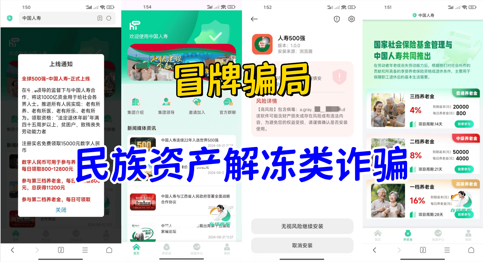 人壽500強(qiáng):冒牌騙局,不法分子冒充中國(guó)人壽公司的名義,制作并散布一系列涉嫌欺詐的APP,虛構(gòu)養(yǎng)老類理財(cái)項(xiàng)目實(shí)施詐騙活動(dòng)。
