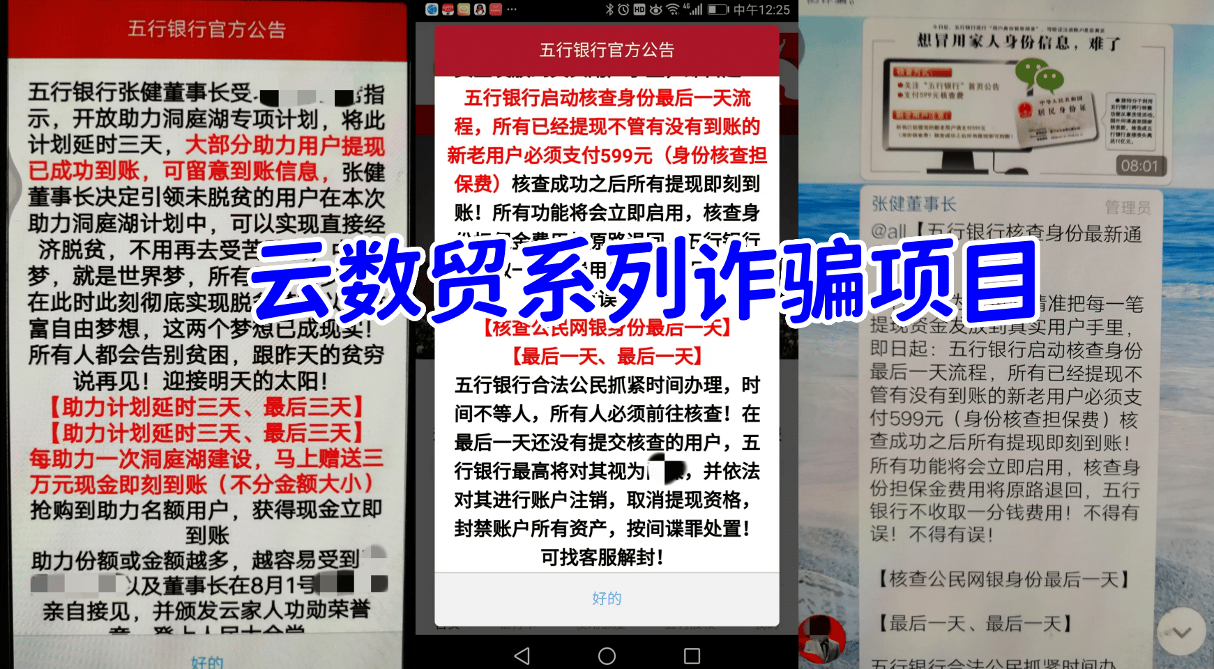 五行銀行:民族資產(chǎn)解凍類詐騙,云數(shù)貿(mào)系列詐騙案,不法分子打著扶貧、中國(guó)夢(mèng)等旗號(hào)實(shí)施詐騙活動(dòng)。