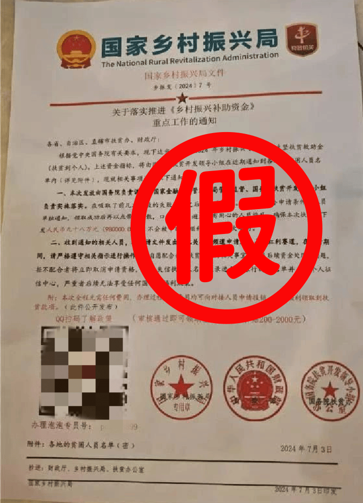 近日,該市民收到一個(gè)陌生快遞,快遞內(nèi)有一份看似正規(guī)的“紅頭文件”?!凹t頭文件”上印著“國家鄉(xiāng)村振興局”“國務(wù)院扶貧開發(fā)領(lǐng)導(dǎo)小組”等印章。民警仔細(xì)看“紅頭文件”的內(nèi)容發(fā)現(xiàn),該“紅頭文件”聲稱,只需要掃碼添加工作人員并驗(yàn)證身份后,即可獲得高額扶貧基金。在該文件的文末還用紅色字體寫著:“本次全程無需任何費(fèi)用,辦理過程中任何費(fèi)用均可向?qū)尤藛T申請報(bào)銷,直至順利領(lǐng)取到扶貧款項(xiàng)?!蔽募淖詈筮€留有一個(gè)二維碼,并注明“QQ掃碼了解政策”。