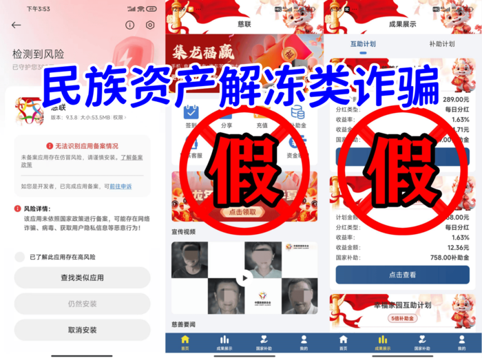 慈聯(lián)APP:民族資產(chǎn)解凍類(lèi)詐騙,不法分子中國(guó)慈善聯(lián)合會(huì)的名義,制作并散布一系列涉嫌欺詐的APP,虛構(gòu)理財(cái)項(xiàng)目實(shí)施詐騙活動(dòng)。