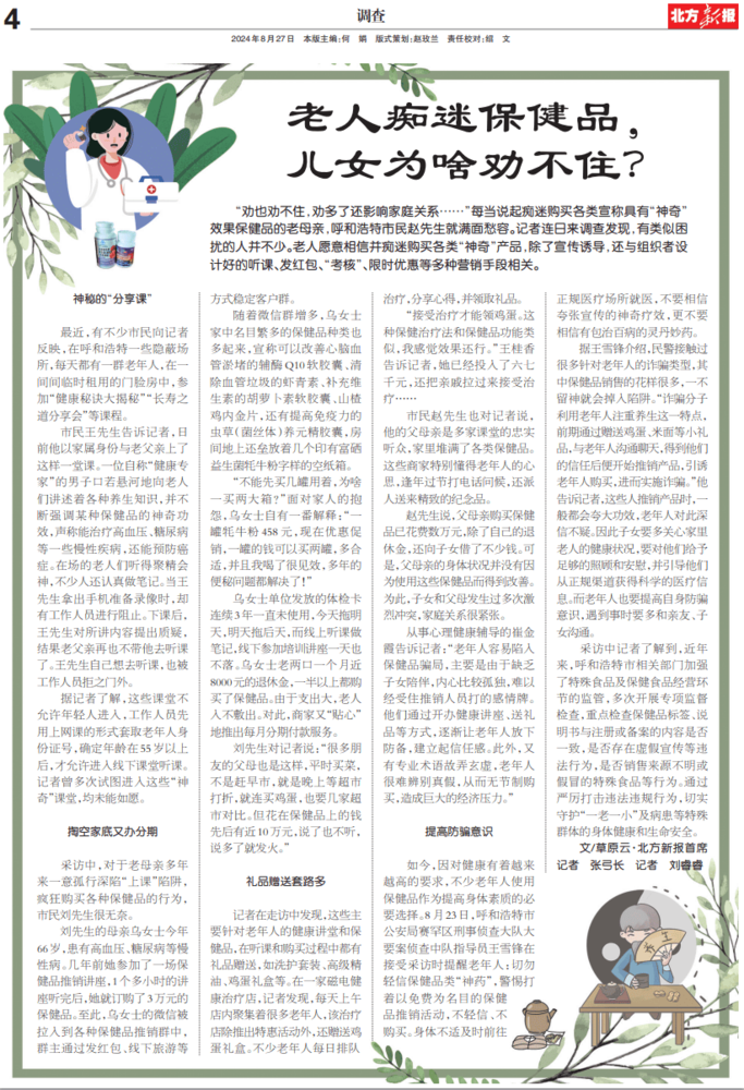 “勸也勸不住,勸多了還影響家庭關(guān)系……”每當(dāng)說起癡迷購買各類宣稱具有“神奇”效果保健品的老母親,呼和浩特市民趙先生就滿面愁容。記者連日來調(diào)查發(fā)現(xiàn),有類似困擾的人并不少。老人愿意相信并癡迷購買各類“神奇”產(chǎn)品,除了宣傳誘導(dǎo),還與組織者設(shè)計好的聽課、發(fā)紅包、“考核”、限時優(yōu)惠等多種營銷手段相關(guān)。