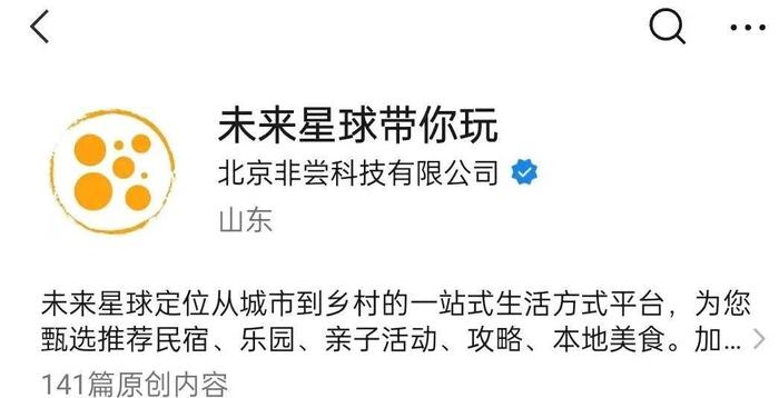 非嘗科技公司稱,自2023年1月1日開始,微信小程序更名為未來星球,通過該微信小程序用戶可以注冊(cè)會(huì)員、預(yù)定民宿、購(gòu)買旅游產(chǎn)品?!巴扑]官”也從2023年1月1日開始,統(tǒng)一改為“實(shí)習(xí)球長(zhǎng)”“月亮球長(zhǎng)”和“太陽(yáng)球長(zhǎng)”。
