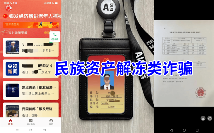 銀發(fā)增幅APP:民族資產(chǎn)解凍類詐騙,不法分子冒充國家某部門的名義,虛構(gòu)養(yǎng)老理財類項目實施詐騙活動。