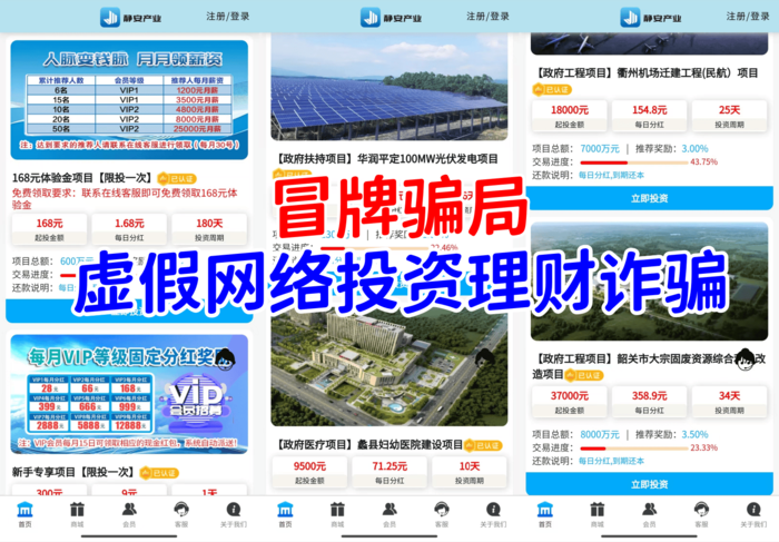 靜安產(chǎn)業(yè)APP:冒牌騙局,虛假投資理財類詐騙,不法分子冒充某公司的名義,制作并散布一系列涉嫌欺詐的APP,虛構(gòu)理財項目實施詐騙活動。