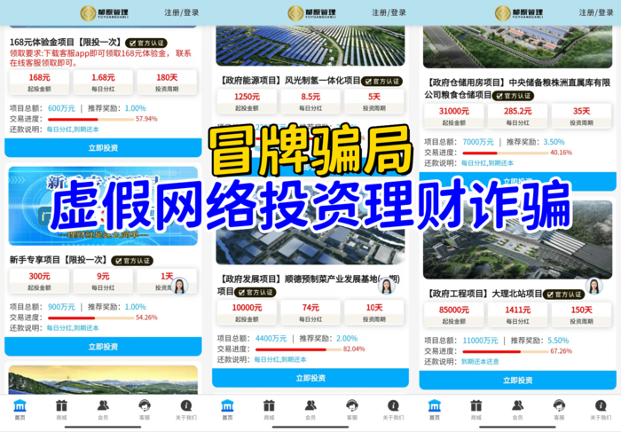 郁原管理APP:冒牌騙局,虛假投資理財類詐騙,不法分子冒充某公司的名義,制作并散布一系列涉嫌欺詐的APP,虛構(gòu)理財項目實施詐騙活動。