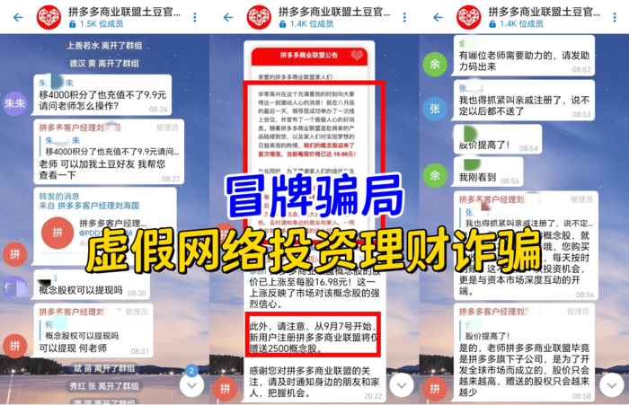 拼多多商業(yè)聯(lián)盟概念股:冒牌騙局,虛假投資理財類詐騙,不法分子冒充拼多多的名義,制作并散布一系列涉嫌欺詐的APP,虛構(gòu)股權(quán)理財項目實施詐騙活動。