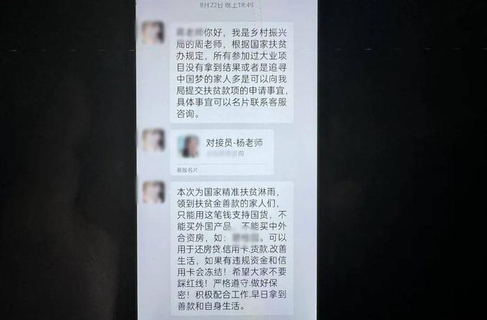 蔣先生表示,對方聲稱自己是鄉(xiāng)村振興局的,現(xiàn)在可以申請一筆扶貧款項,該款項只能用于支持國貨或者用于還房貸、信用卡等,需要添加專門的對接員。蔣先生在得知可以申請扶貧款后添加了該對接員,對方稱需要驗資,還將蔣先生拉入群聊,蔣先生在群內(nèi)對接相關(guān)事宜時,警方聯(lián)系上了蔣先生。