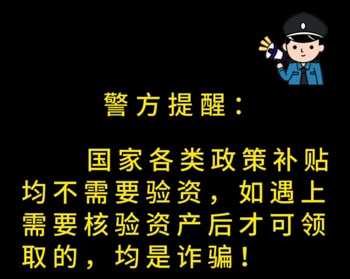 警方提醒:國家各類政策補貼均不需要驗資,如遇上需要核驗資產(chǎn)后才可領(lǐng)取的均是詐騙。