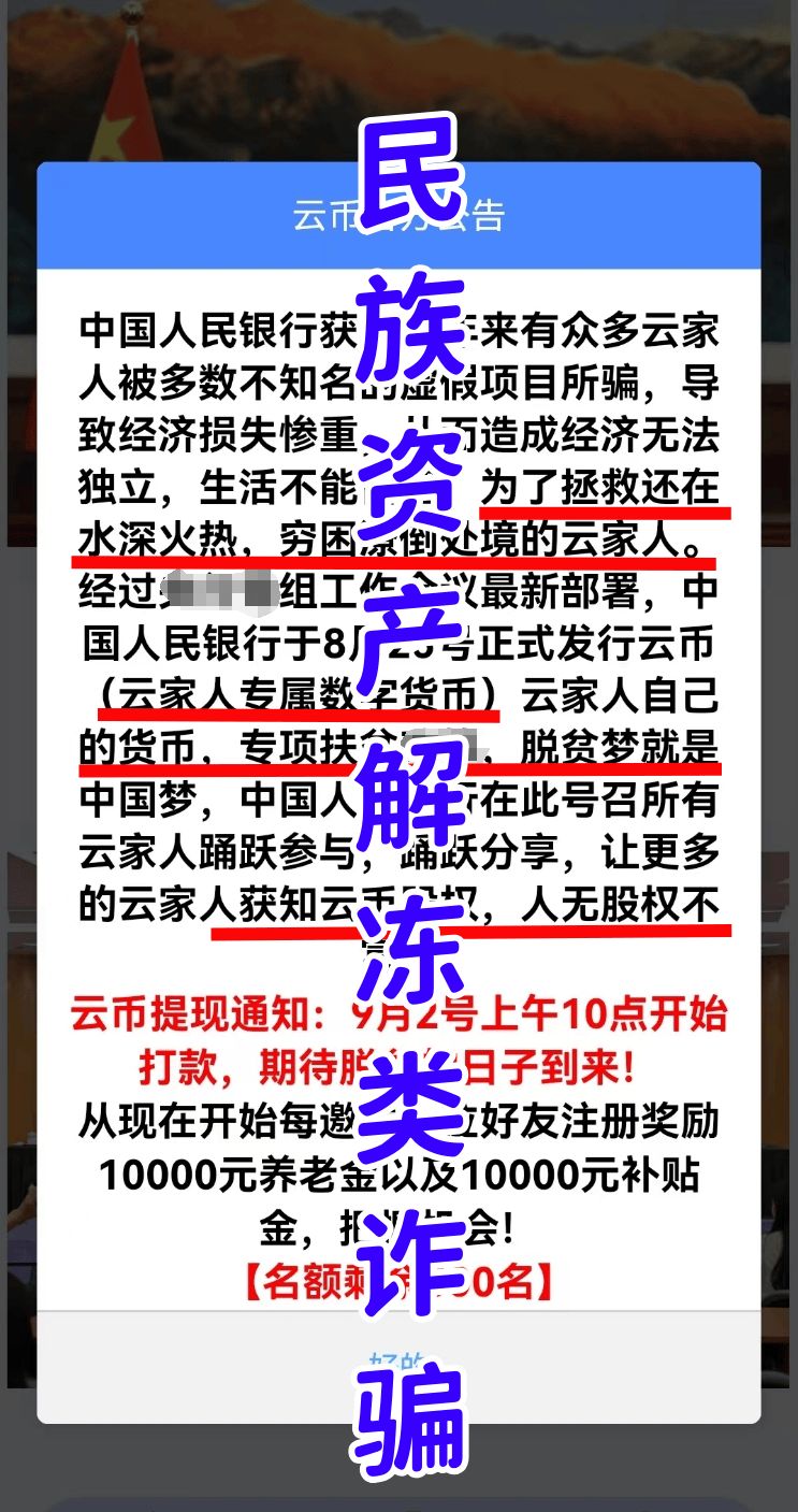 云幣APP:民族資產(chǎn)解凍類詐騙,不法分子冒充國家某部門的名義,打著扶貧、拯救“云家人”“追夢人”的旗號,虛假推出云幣數(shù)字貨幣類理財項目,實施詐騙活動。