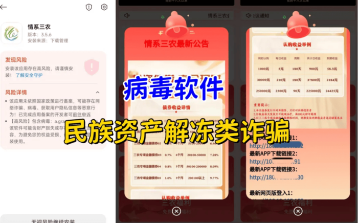情系三農(nóng)APP:民族資產(chǎn)解凍類詐騙,病毒軟件,不法分子冒充國家的名義,打著扶貧、三農(nóng)補貼等旗號,虛構(gòu)國債等理財項目實施詐騙活動。