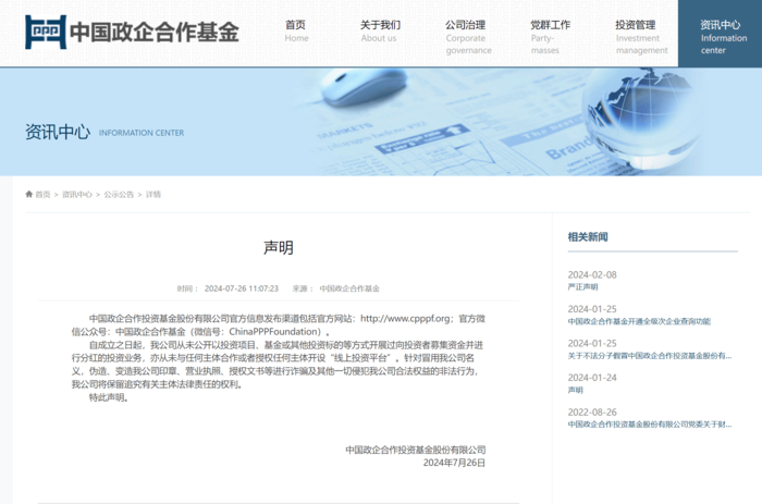 中國政企合作投資基金股份有限公司官方網(wǎng)站就發(fā)布公開聲明:我公司從未公開以投資項目、基金或其他投資標(biāo)的等方式開展過向投資者募集資金并進行分紅的投資業(yè)務(wù),亦從未與任何主體合作或者授權(quán)任何主體開設(shè)“線上投資平臺”。