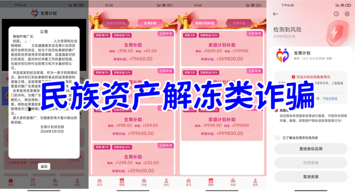 計劃生育APP:民族資產(chǎn)解凍類詐騙,不法分子冒充國家某部門的名義,制作并散布一系列涉嫌欺詐的APP,虛構(gòu)生育補助、家庭計劃補助等高額返利項目實施詐騙活動。
