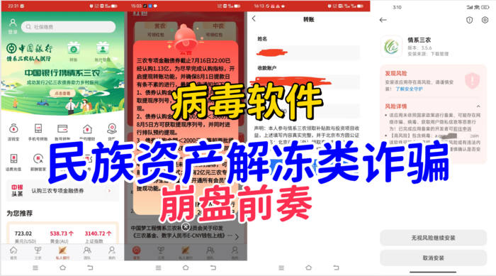 情系三農(nóng)APP:民族資產(chǎn)解凍類詐騙,病毒軟件,不法分子冒充國家某部門的名義,虛構(gòu)理財項目實施詐騙活動。據(jù)網(wǎng)友反饋,該項目要求參與者繳納費用公證,疑似準備崩盤跑路,最后的收割,參與者積極舉報。