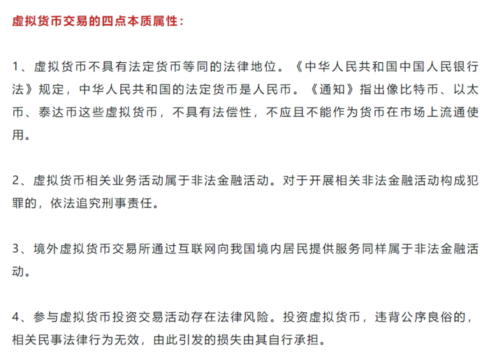 我國目前不承認虛擬貨幣的法定地位,任何從事代幣發(fā)行融資行為均屬非法,我國任何交易平臺都不得從事法定貨幣與代幣或虛擬貨幣之間的兌換業(yè)務(wù),不得買賣代幣或虛擬貨幣,不得為代幣和虛擬貨幣提供定價、信息中介等服務(wù)。