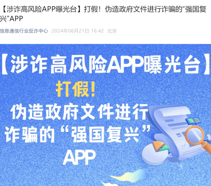 今年6月21日,信息通信行業(yè)反詐中心發(fā)布《【涉詐高風(fēng)險APP曝光臺】打假!偽造政府文件進行詐騙的“強國復(fù)興”APP》,文中詳細揭露了該詐騙平臺。