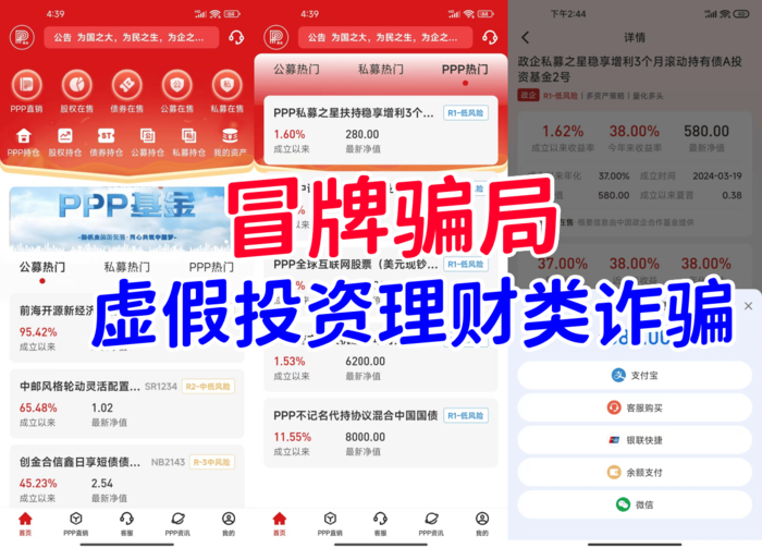 中國政企APP、PPP基金APP:冒牌騙局,不法分子冒充中國政企公司的名義,制作并散布一系列涉嫌欺詐的APP,虛構(gòu)推出公募、私募等高額返利的理財(cái)項(xiàng)目實(shí)施詐騙活動(dòng)。