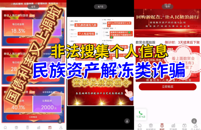 中國算力APP:民族資產(chǎn)解凍類詐騙,虛假投資理財(cái)詐騙,不法分子冒充國家某部門的名義,制作并散布一系列涉嫌欺詐的APP,虛構(gòu)理財(cái)項(xiàng)目實(shí)施詐騙活動(dòng)。