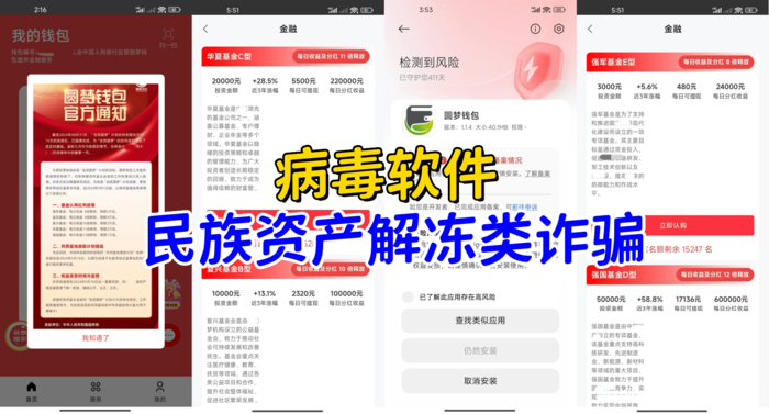 圓夢錢包APP:民族資產解凍類詐騙,帶病毒軟件,不法分子冒充國家某部門的名義,制作并散布涉嫌欺詐的APP,虛構推出“富民基金”、“華夏基金”等高額返利理財項目實施詐騙。