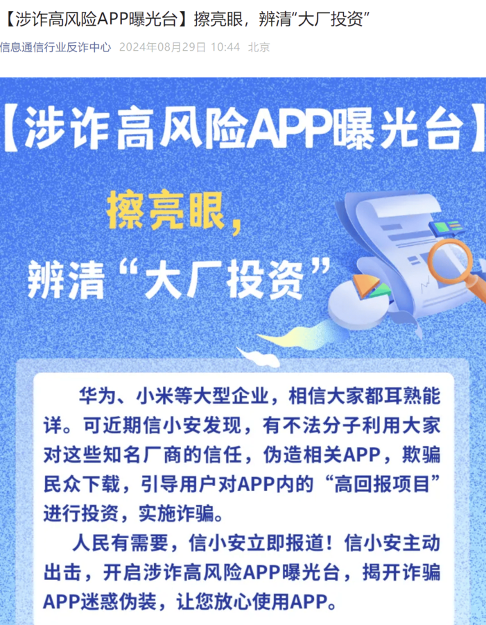 在8月29日,信息通信行業(yè)反詐中心發(fā)布《【涉詐高風險APP曝光臺】擦亮眼,辨清“大廠投資”》文章,文章中明確寫明,有不法分子利用大家對這些知名廠商的信任,偽造相關APP,欺騙民眾下載,引導用戶對APP內的“高回報項目進行投資,實施詐騙。
