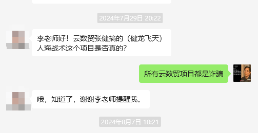 “健龍飛天”:民族資產(chǎn)解凍類詐騙,據(jù)網(wǎng)友反饋,該項(xiàng)目宣傳是云數(shù)貿(mào)張健搞的項(xiàng)目,9月3日崩盤跑路。