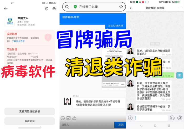 “中國太平”清退平臺(tái):帶病毒軟件,經(jīng)了解,該平臺(tái)冒充“中國太平資產(chǎn)管理有限公司”的名義,打著“清退資產(chǎn)”幌子,非法搜集個(gè)人信息,實(shí)施詐騙活動(dòng)。