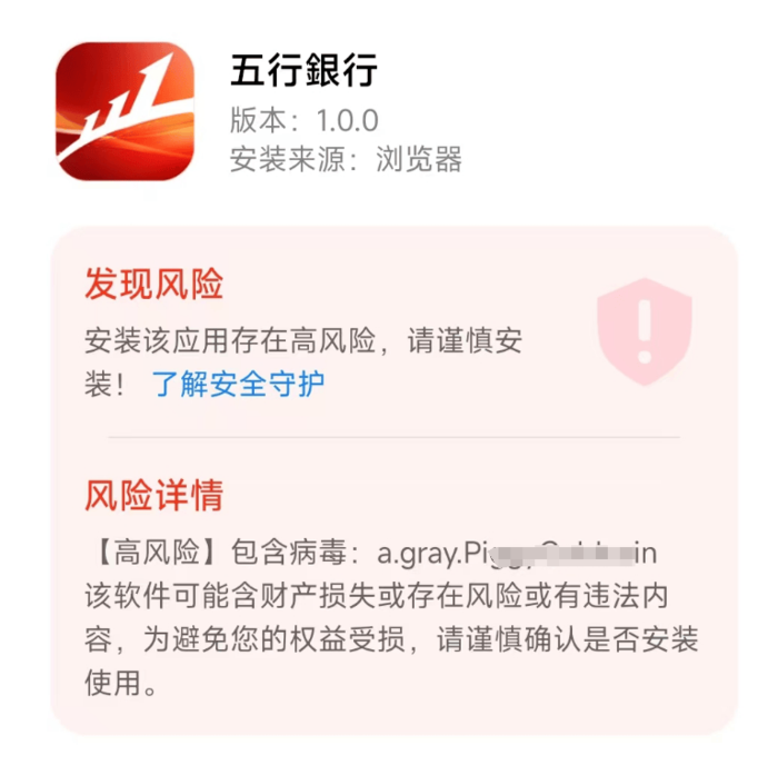 “五行銀行”APP:帶病毒軟件,民族資產(chǎn)解凍類詐騙,不法分子冒充云數(shù)貿(mào)張健的名義,打著扶貧、中國夢等旗號(hào)實(shí)施詐騙活動(dòng)。
