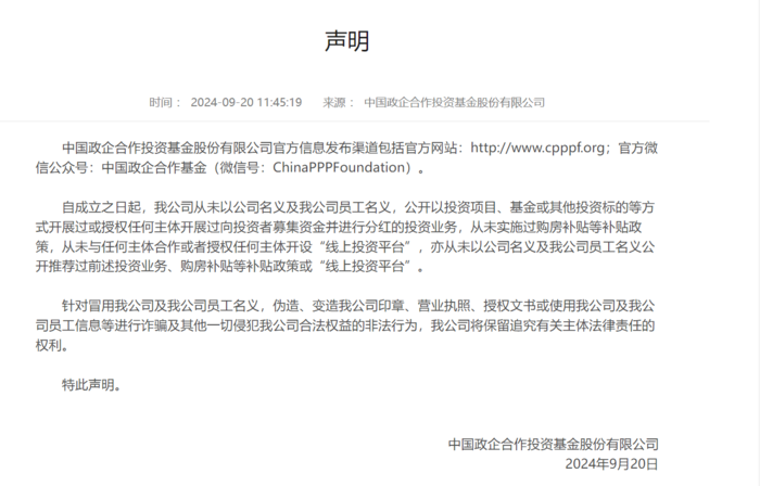 此前中國政企公司就發(fā)布公告,從未與任何主體合作或者授權(quán)任何主體開設(shè)“線上投資平臺(tái)”,亦從未以公司名義及我公司員工名義公開推薦過前述投資業(yè)務(wù)、購房補(bǔ)貼等補(bǔ)貼政策或“線上投資平臺(tái)”。