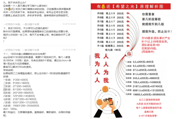 該項(xiàng)目要求每位參與者繳納1800元啟動(dòng),分享給3---5位負(fù)債?使??具即可回本,通過眾chou+倍增+現(xiàn)?流?式獲得籌款,鼓吹最?可以解決590w的債務(wù)。