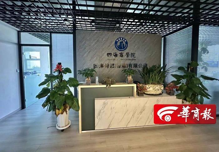 根據(jù)受騙者提供的線索,9月24日,華商報大風新聞記者來到西安金橋三路附近“前海人壽金融中心”,在一棟名為“前海人壽”的樓上,找到了“四海傳媒”公司。記者看到,公司大門鎖著,但大門旁邊的打卡機還亮著燈。透過玻璃大門望進去,前臺墻壁上顯示著公司的名字:四海商學院四海傳媒(香港)有限公司。前臺上有的綠植已經(jīng)枯萎,有的辦公室敞開著門。記者敲了大門,沒人應答。