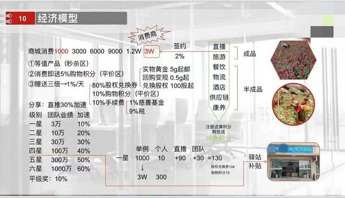 年初,張先生偶然接觸到“郵某某州”項(xiàng)目,負(fù)責(zé)人趙某介紹稱這是在國(guó)家發(fā)改委頒布的《促進(jìn)綠色消費(fèi)實(shí)施方案》的指導(dǎo)下,響應(yīng)國(guó)家“運(yùn)用綠色積分促進(jìn)消費(fèi)”的號(hào)召而開(kāi)設(shè)的一家線上線下一體化商城。涉及直播、旅游、餐飲、酒店、物流供應(yīng)鏈、康養(yǎng)等多條產(chǎn)業(yè)鏈。