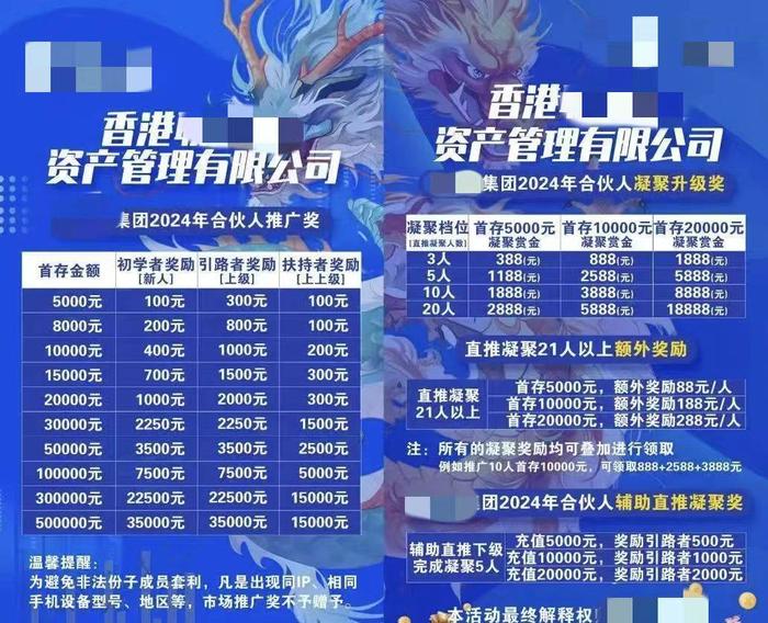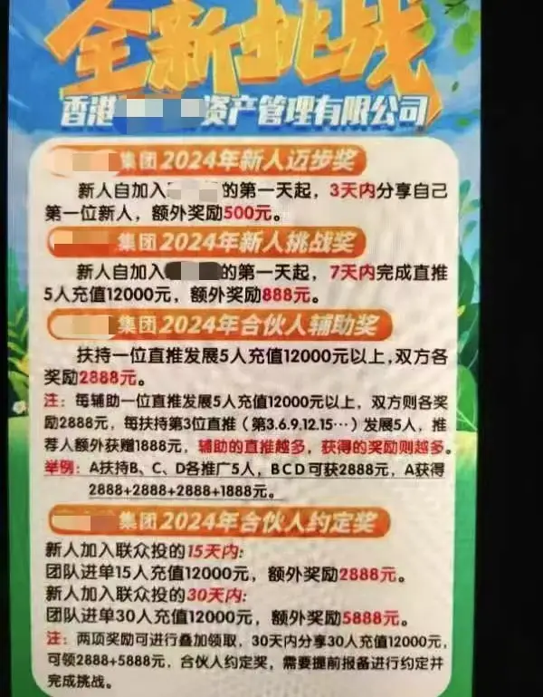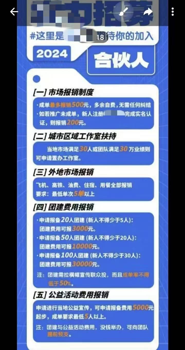 “聯(lián)某投”為了大力招募“合伙人”,推出了市場報銷制度,推廣成單可根據(jù)投資檔位進行報銷,最高可報銷500元,新人注冊完成實名制報銷200元;達到團隊和業(yè)績標(biāo)準(zhǔn)可申辦工作室;單次成單5單以上報銷外地差旅費;在成單率不低于50%的基礎(chǔ)上,滿足一定團建人數(shù)和新人人數(shù)可報銷單次團建費用;甚至連申請當(dāng)?shù)毓婊顒?,在成單不低?人的基礎(chǔ)上,都可以拿到5000元以上的活動經(jīng)費。