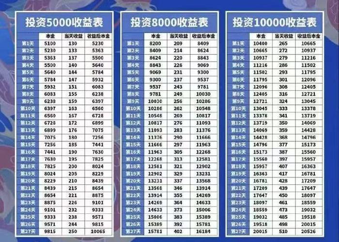 根據(jù)平臺規(guī)定,用戶可根據(jù)5100元、8200元、10400元三個檔位自行選擇進行投資,按照日均3%的漲幅每日復(fù)利,27天后可提現(xiàn)。