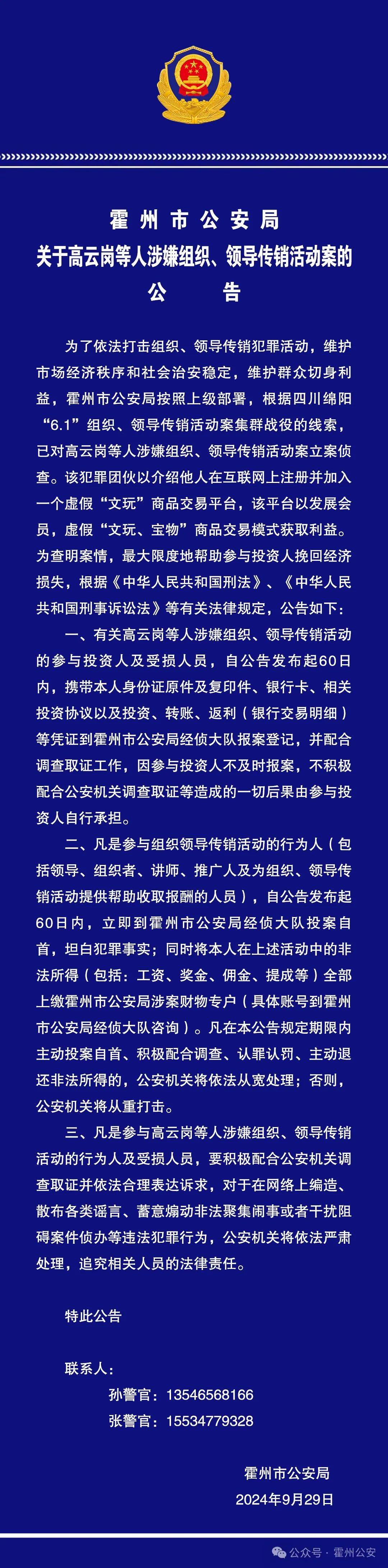 關(guān)于高云崗等人涉嫌組織、領(lǐng)導(dǎo)傳銷活動(dòng)案的公告
