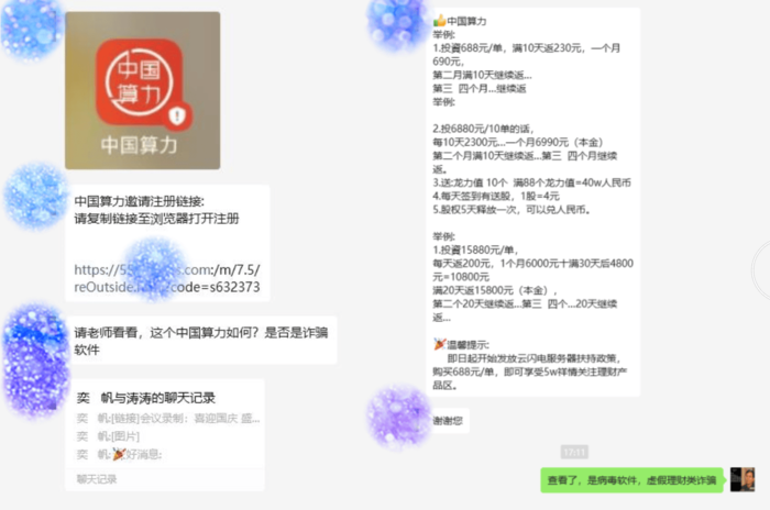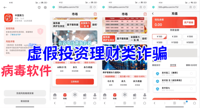 不法分子冒充國家某部門的名義,制作并散布涉詐騙“中國算力”APP,虛構(gòu)并推廣“養(yǎng)護(hù)套餐永久體現(xiàn)A”、“服務(wù)器升級(jí)養(yǎng)護(hù)A檔”、“共筑算力一張網(wǎng)云閃電服務(wù)器”等高額返利理財(cái)項(xiàng)目實(shí)施詐騙活動(dòng)。