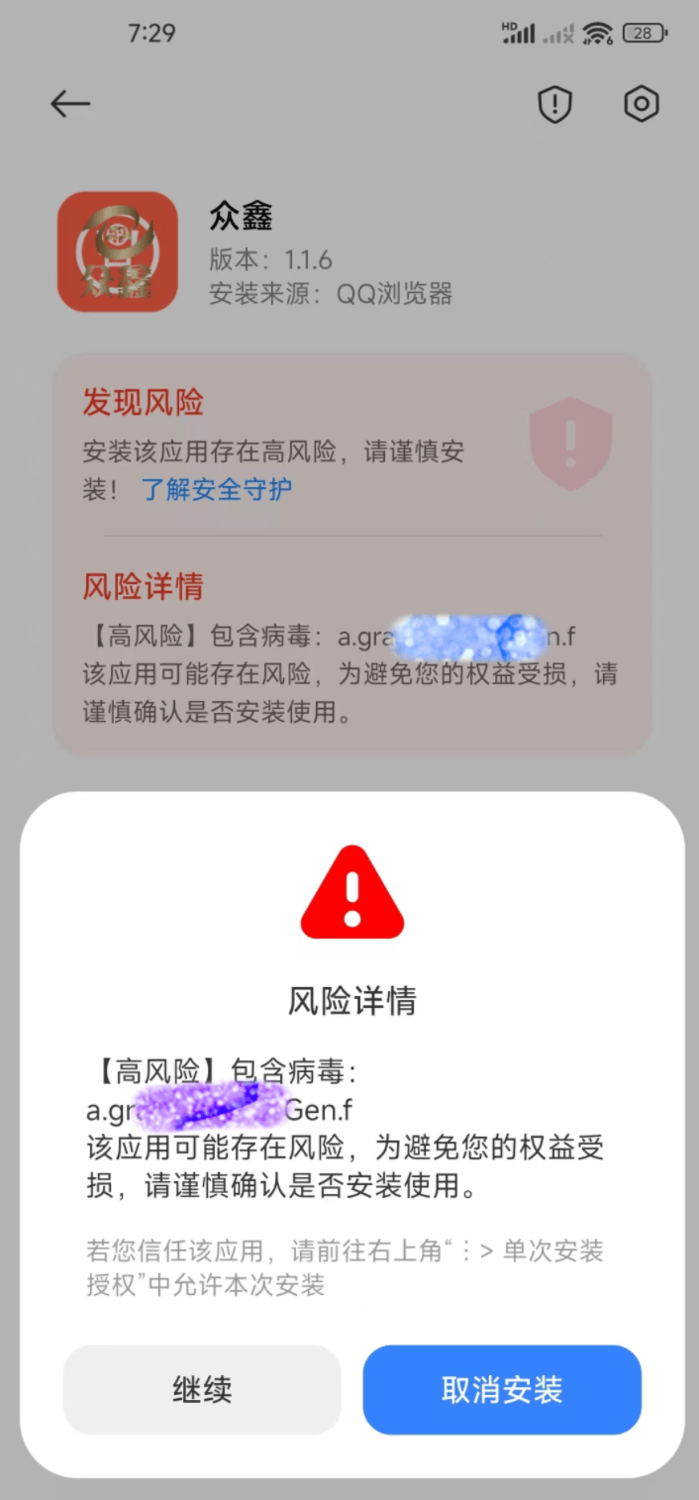 4、偽造的“眾鑫”APP:虛假理財(cái)類詐騙,病毒軟件